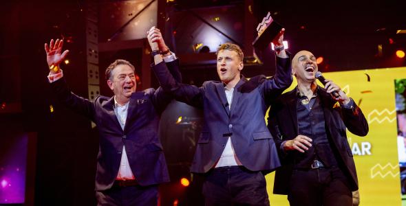 Twee mannen samen met de Sporter van het jaar 2024 tijdens de Eindhoven SportAwards